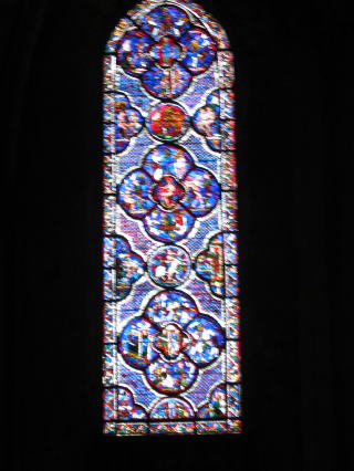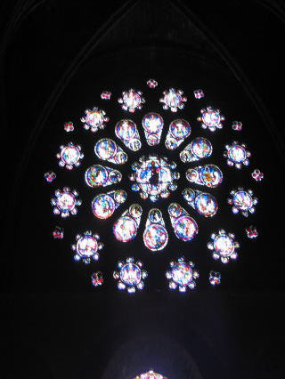 | 西のバラ窓 13世紀以降は「最後の審判」が描かれ 中心にイエスさま 周りは動物と天使が囲む |